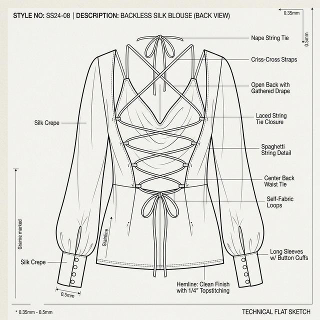 Celebrating the allure of the back profile, our backless blouses are masterpieces of structural engineering. We balance daring skin reveals with perfect support, using custom tie-ups (Doris), tassels, and strategic strap placements to ensure the blouse stays perfectly in place.